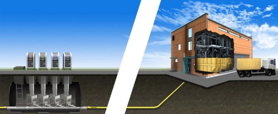 Beboerne skal smide deres affald i skakte, hvorfra det kommer på en lille kilometers rejse under jorden med 70 kilometer i timen – indtil det lander i det centrale sugeanlæg, der er placeret i Enggade. Denne ”affaldsmetro” kan håndtere både restaffald, plastik og papir/pap.