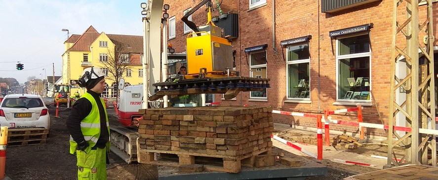 Det har været særlig kompliceret, da de odenseanske klinker ligger i sildebensmønster. Derfor er det vigtigt, at der bliver placeret et sug på hver enkelt klinke, for at få dem alle med.