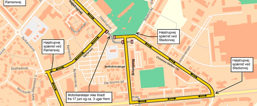Det betyder, at hvis man plejer at køre ad eksempelvis Stadionvej eller Christmas Møllers Vej for at fortsætte ud af Højstrupvej, så skal man for en periode køre en anden vej. For eksempel ad Bystævnevej og Rømersvej.
