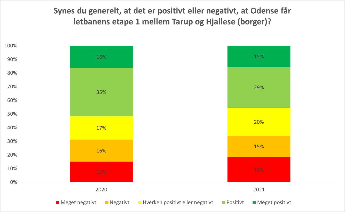 Undersøgelsen viser, at andelen af odenseanere, som er ”positive” eller ”meget positive” over for letbanen falder fra 51 procent i 2020 til 45 procent i procent i 2021.