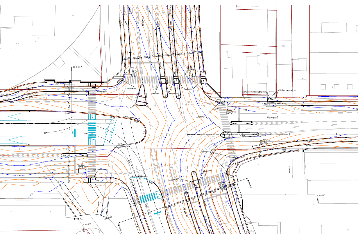 Tegning over højdekurver i krydset Nyborgvej / Ejbygade