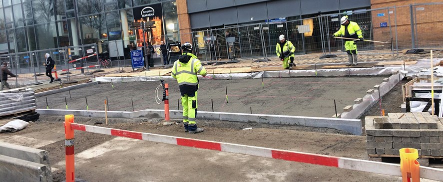 I første omgang er det den del af busbanen, som fremover skal være fodgængerfelt lige foran banegårdens hovedindgang, der har fået lag beton. Derefter vil arbejde forsætte på resten af strækningen foran banegårdsbygningen.