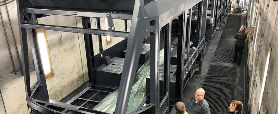 Her bliver chassiset monteret med al den indpakning og indmad, som forvandler et råt stålskelet til en moderne og komfortabel letbanevogn i et design, der er specielt tilpasset Odense.