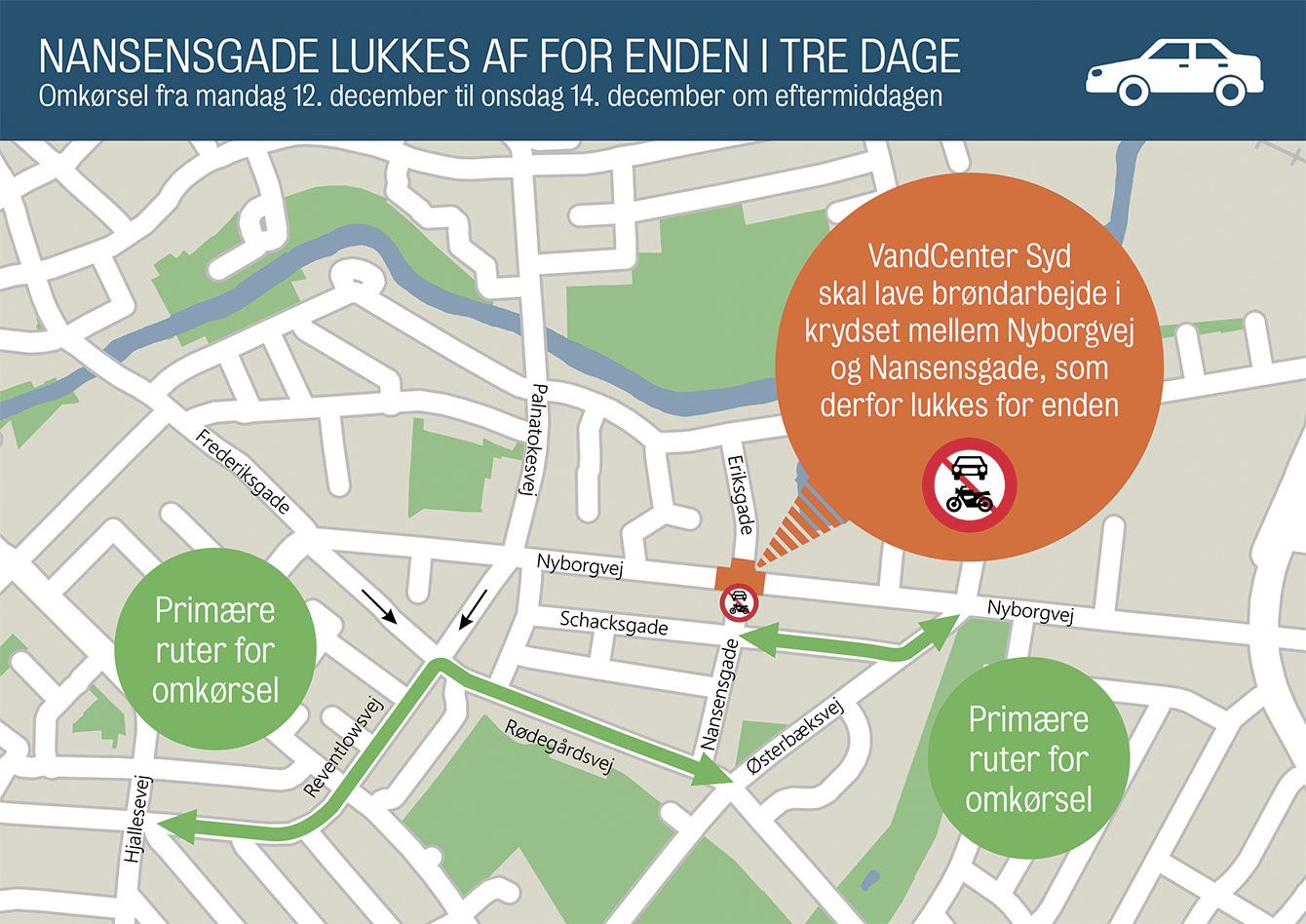 VandCenter Syd skal lave brøndarbejde i krydset ved Nyborgvej og Nansensgade. Derfor er det nødvendigt at lukke af for ind- og udkørsel til Nansensgade fra mandag 12. december om morgenen til onsdag 14. december om eftermiddagen.