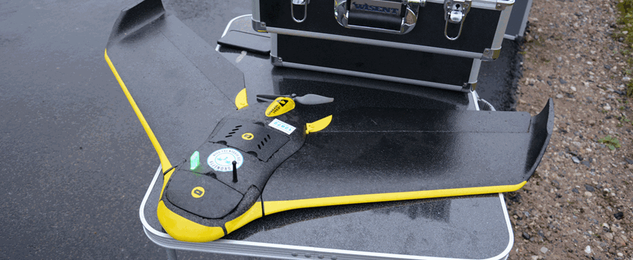 Droneoperatør Christian Wiggers fra DroneFyn, som forestår Odense Letbanes droneflyvninger, holder letvægtsdronen, eBee'en, som blandt andet består af flamingopap.