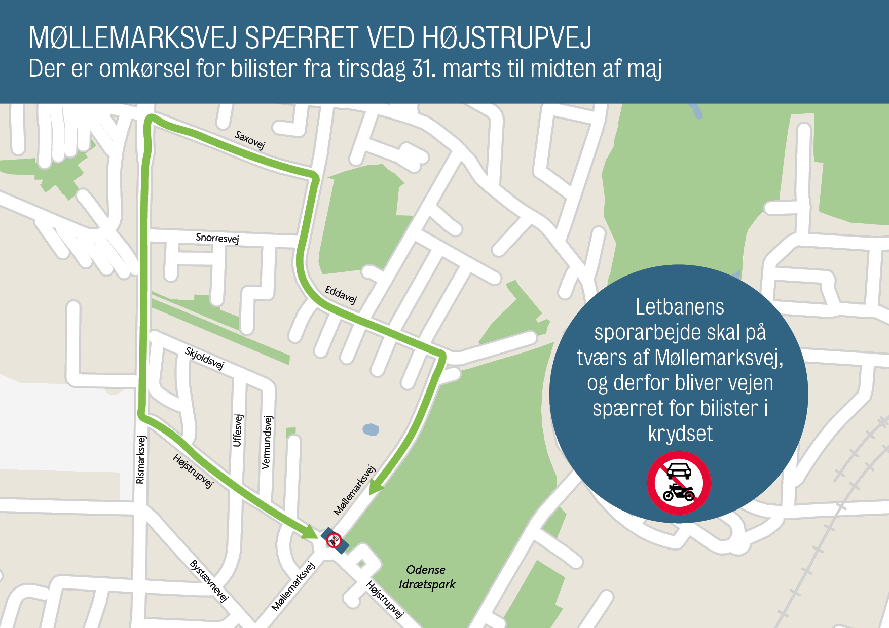 Fra tirsdag 31. marts begynder færdiggørelsen af sporarbejdet i krydset ved Møllemarksvej og Højstrupvej. Derfor bliver krydset spærret for biltrafik til og fra den nordlige del af Møllemarksvej.