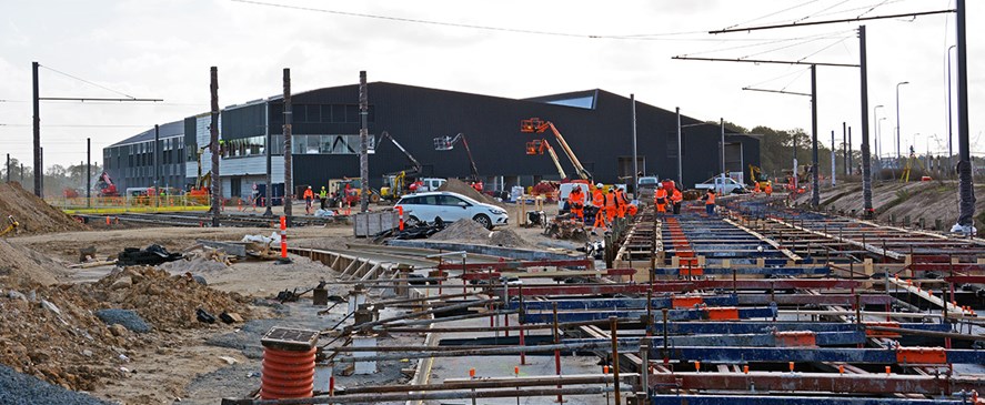Odense Letbanes entreprenør på sporarbejdet, COMSA, koncentrerer mange af kræfterne i området omkring kontrolcenteret – for at sikre, at det er klart til at modtage de første letbanetog, når de kommer til Odense omkring nytår.