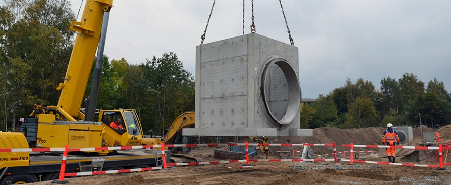Betonelementet i bunden af hver brønd vejer 22 tons. Og hvert betonelement i røret mellem dem vejer 12 tons. Derfor måtte en enorm og 70 ton tung kran køres ind fra Svendborg, så elementerne kan blive placeret med stor nøjagtighed.