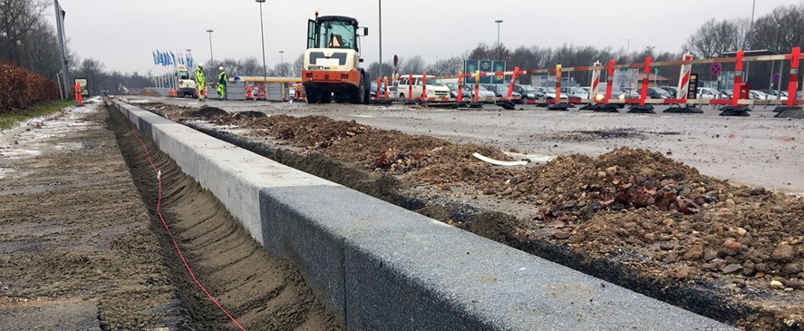 De første såkaldte ’bordursten’ er netop blevet lagt ved Bilkas P-plads langs Ørbækvej og Niels Bohrs Alle.