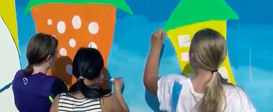 Elever fra Odense Friskole dekorerer letbanens byggehegn